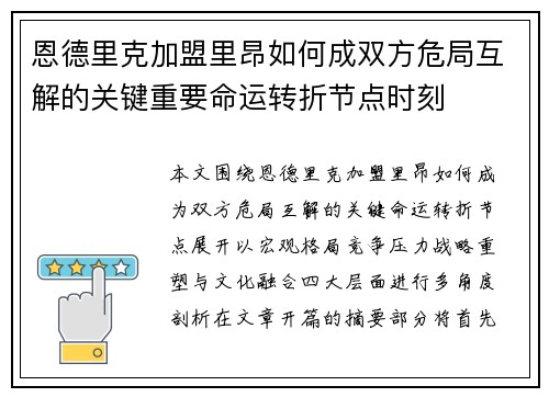 本篇文章整体聚焦于球员孔德因伤暂未随队训练,而球队医疗及教练团队预计他将于今日恢复正常训练状态的这一重要动态。文章首先简要概括了这一事件的来龙去脉,并从四个层面展开解析:一是伤情情况与恢复进度,二是他缺席训练对球队整体的影响,三是恢复训练对他个人竞技状态的意义,四是球队接下来的应对与安排。每一部分均从多个角度、多个自然段予以详述,力图全面、深入地剖析这一讯息在技术、心理、战略及团队层面的多重涵义。...